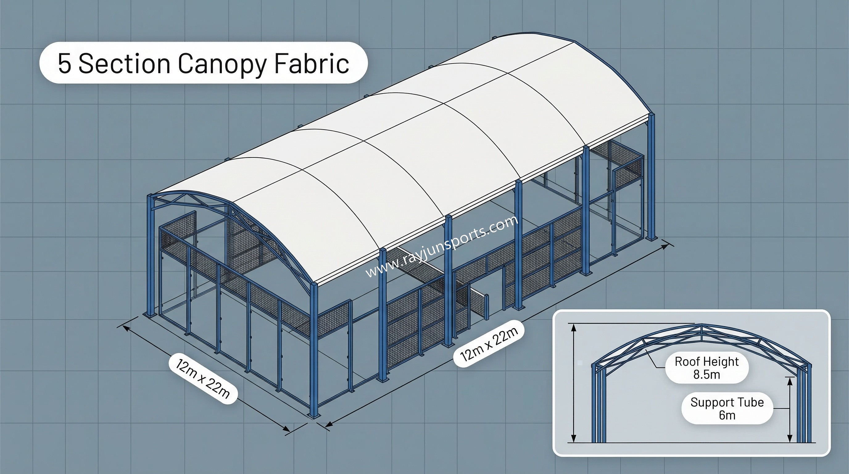 · Modular Design: The canopy fabric is divided into sections (e.g., 5 segments), making it easier to replace or repair specific sections of the canopy without dismantling the entire roof. This is particularly advantageous for applications that require regular maintenance or cleaning.