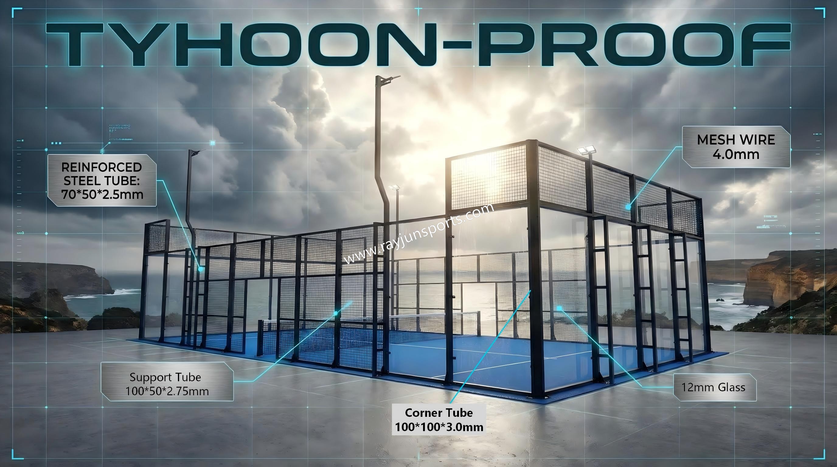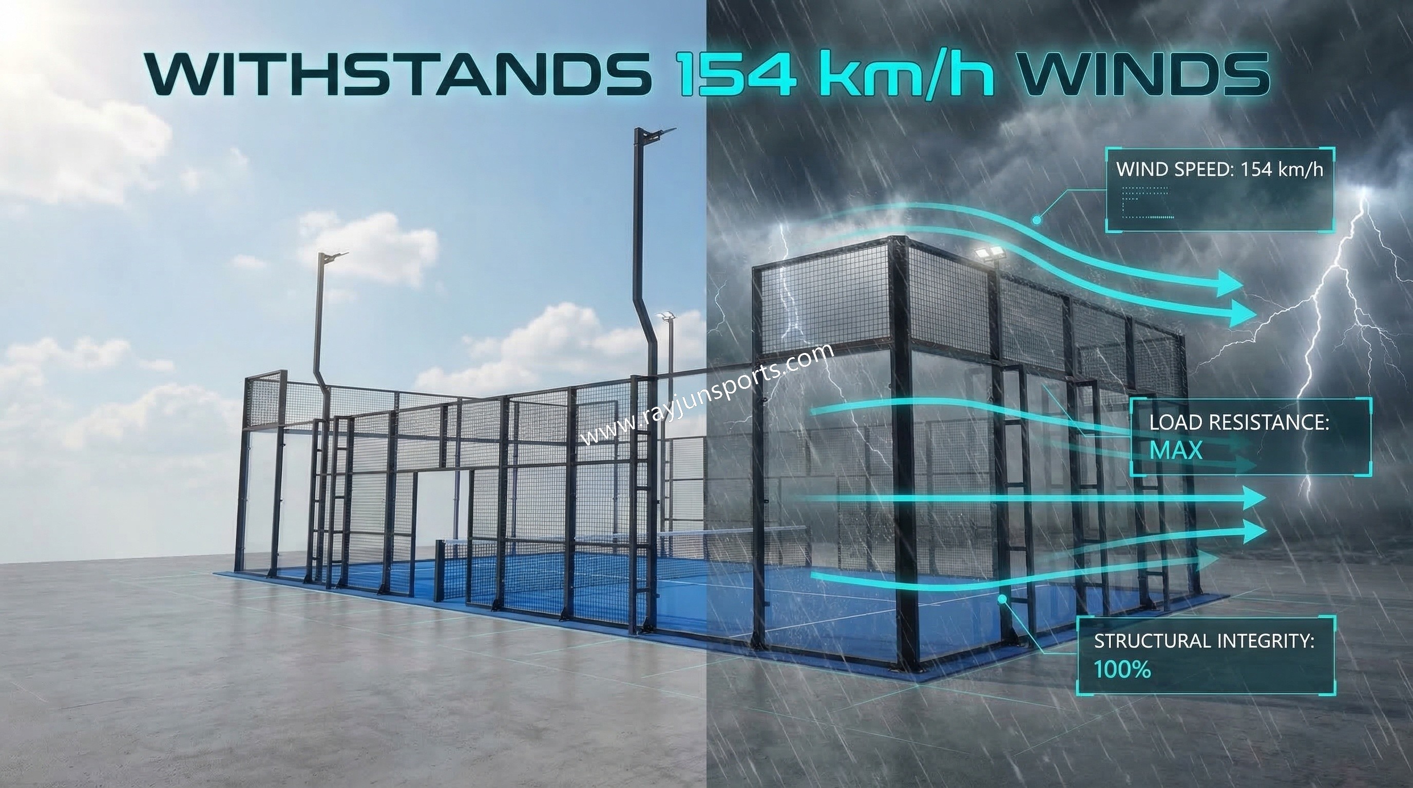 Our Wind-Resistant Padel Court is engineered to withstand wind speeds up to 154 km/h, delivering unmatched stability, safety, and reliability — even in the harshest environments.